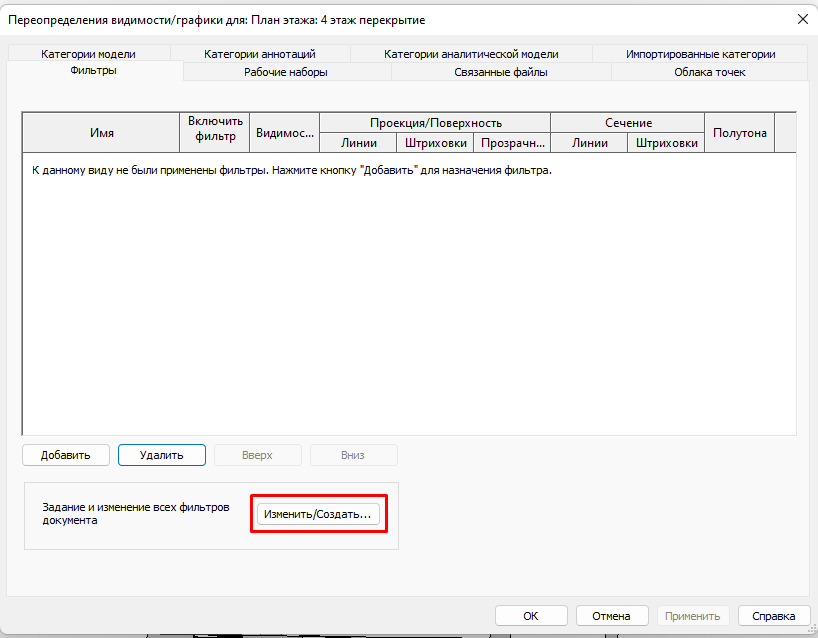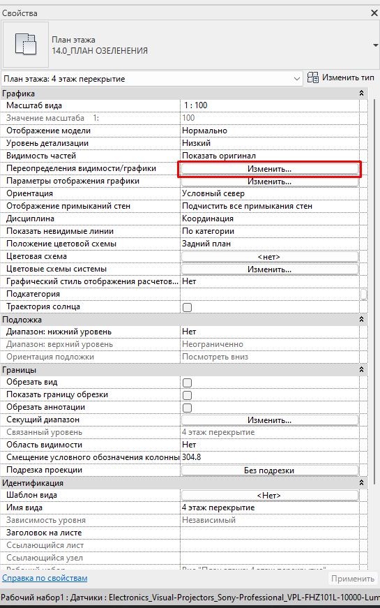 Чтобы управлять фильтрами найдите на панели «Свойства» в графе «Графика» строку «Переопределение видимости /графики» и нажмите «Изменить…». В открывшемся окне выберите вкладку «Фильтр».
