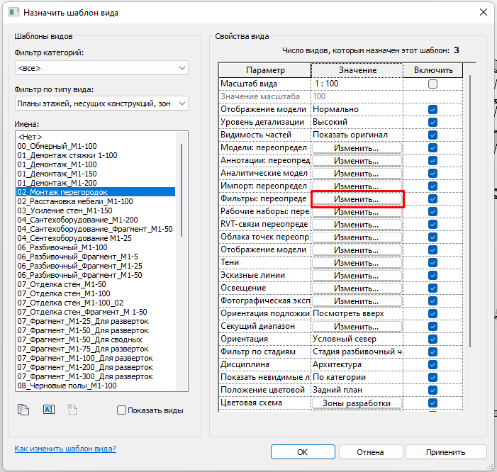 «Шаблон вида» — «Фильтры: переопределение видимости/графики» —