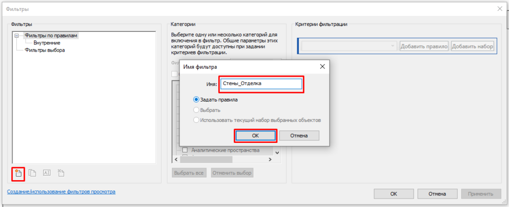 Предположим нам нужно перекрасить всю отделку в красный, чтобы она отличалась от стен. По этому же фильтру можно будет скрыть всю отделку с нужных видов. Для этого в открывшемся окне находим значок «Создать», в окне «Имя фильтра» вводим сначала название категории, а потом уточнение через нижнее подчеркивание.  ОК.