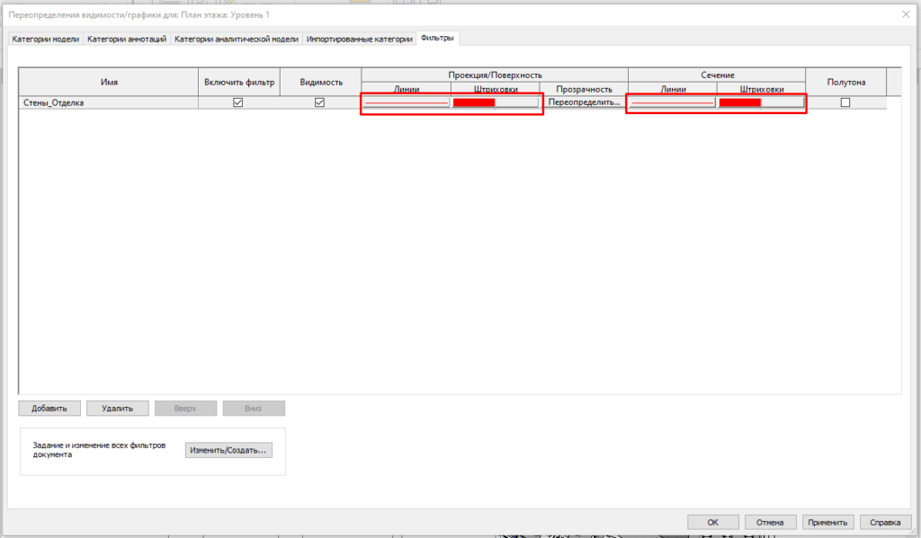 Если убрать галку с графы «Видимость», стены вообще не будут видны на данном виде. Или, если убрать «Включить фильтр», красного переопределения не будет.