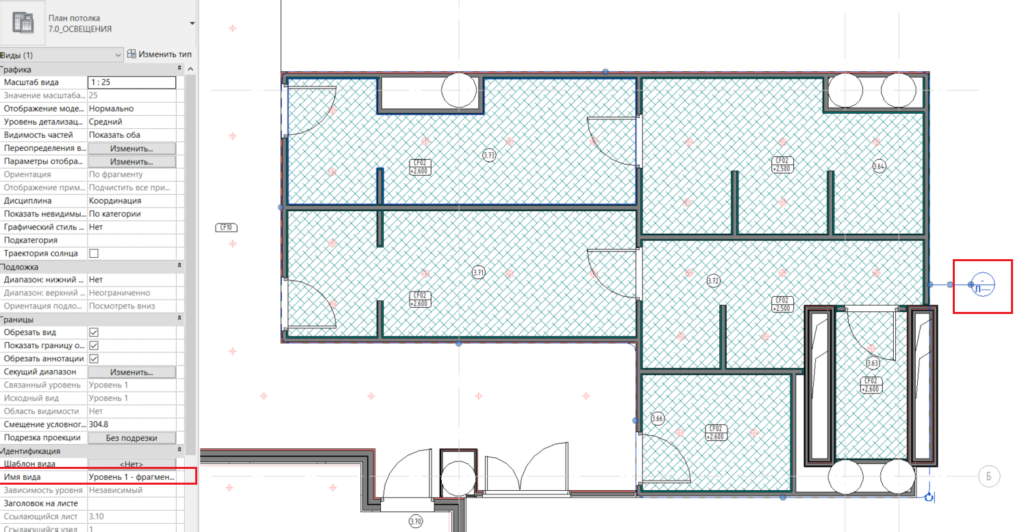 После завершения операции на основном виде появится контур фрагмента и марка. Так же, если его выделить, на панели свойств появятся его характеристики, в том числе название, по которому его можно найти в «Диспетчере проекта» в разделе «Виды».
