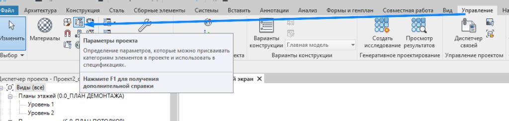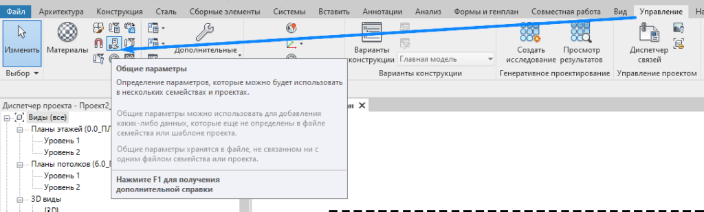 Для добавления общего параметра в проект перейдите на вкладку «Управление» – «Параметры проекта»: