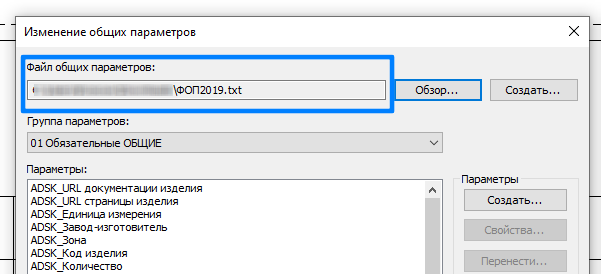 Если файл общих параметров подгружен в проект, то в выделенном поле будет отображен путь к нему: