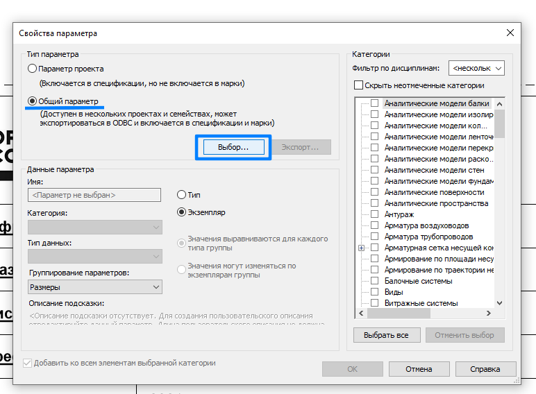 В появившемся окне свойств параметра нужно переключить тип параметра на значение «Общий параметр» и нажать кнопку «Выбор»: