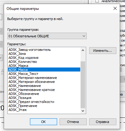 В новом окне отобразится список общих параметров, доступных для добавления в проект. Выберите нужную группу в