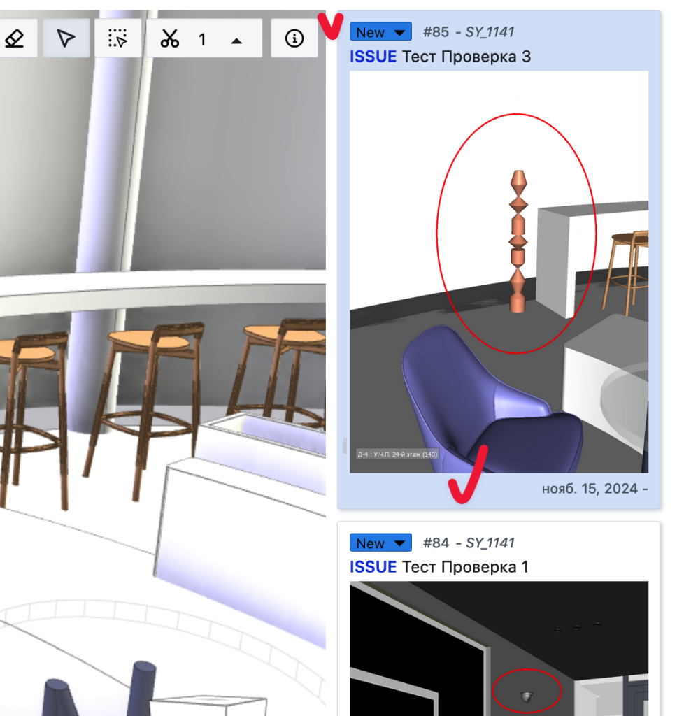 | Сечение | Создать сечения и управлять ими через выпадающее меню справа от кнопки *рекомендуется активировать инструмент, создать сечение, после этого сразу переключиться на инструмент Выделить чтобы принудительно закончить редактирование секущих плоскостей *созданное сечение без привязки к Замечанию — временный элемент (пропадет после перезагрузки страницы) |