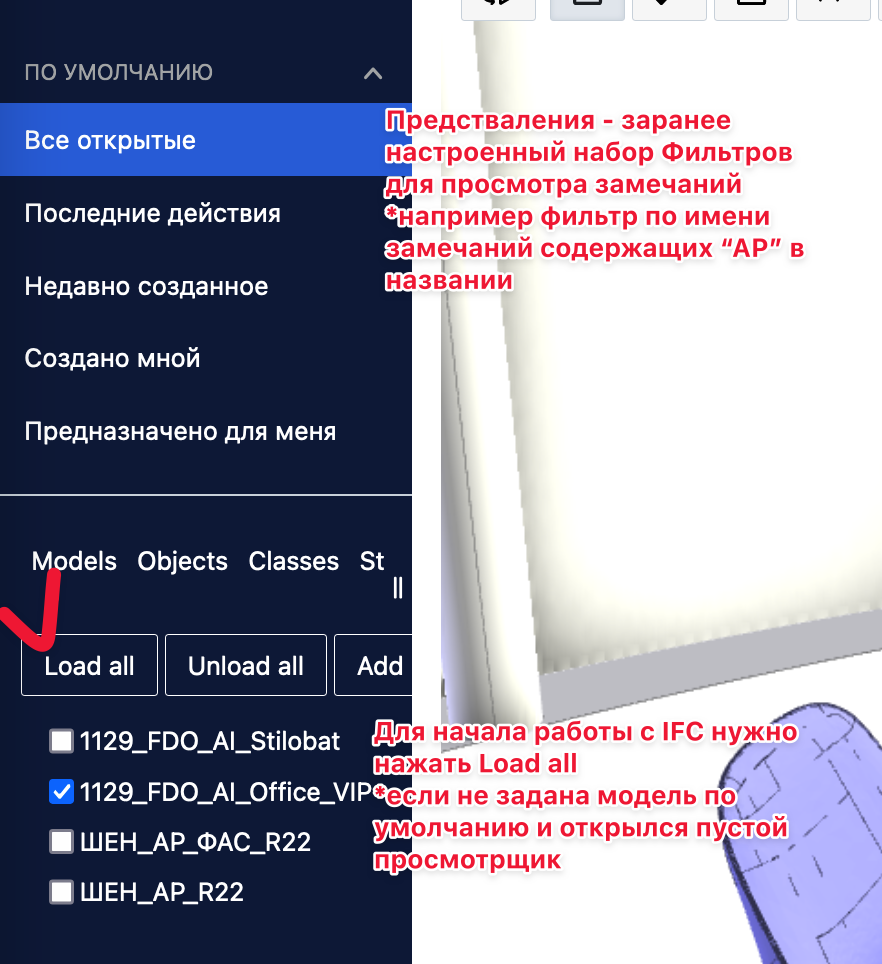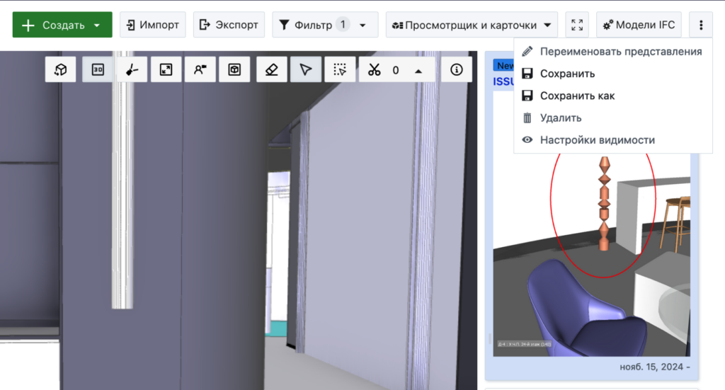 Меню над просмотром IFC: