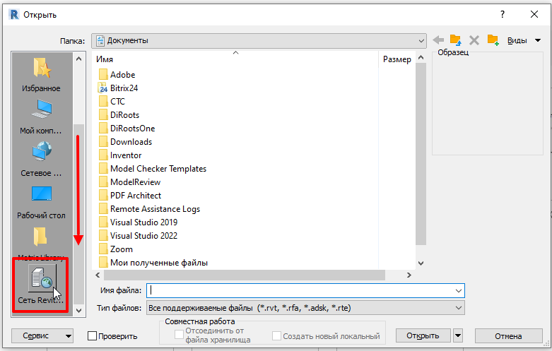 3.На левой панели диалогового окна «Открыть» щелкните элемент «Сеть Revit Server».