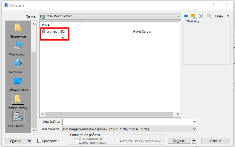 Открытие модели с Revit Server