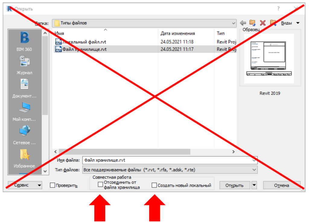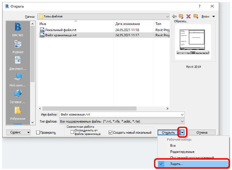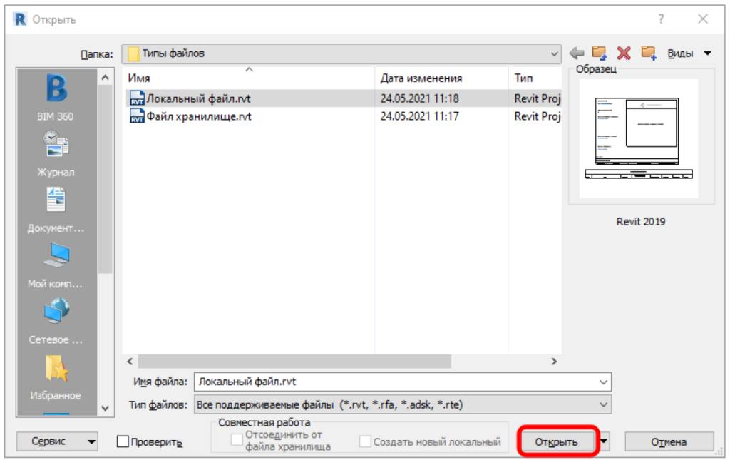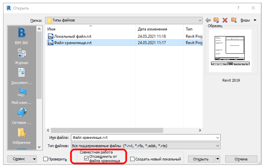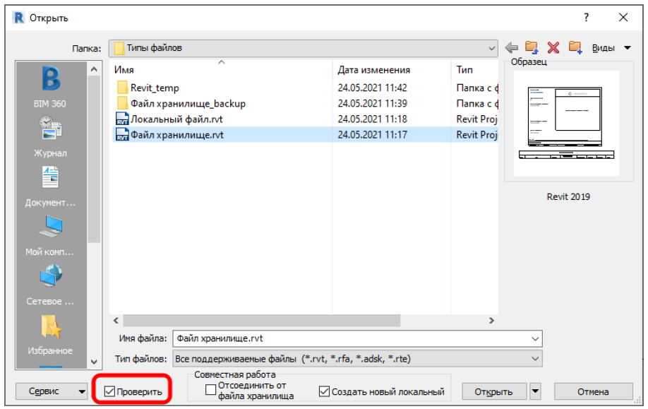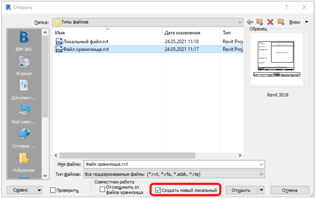 Файл хранилище — специальный файл Revit, связанный с локальными копиями. Через этот файл происходит синхронизация между файлами всех исполнителей, таким образом все работают в актуальной модели. Чтобы начать работать необходимо подключиться к файлу хранилища, создав локальную копию этого файла. Для этого, при открытии файла хранилища, необходимо установить галочку «Создать новый локальный». Далее нажать «Открыть».