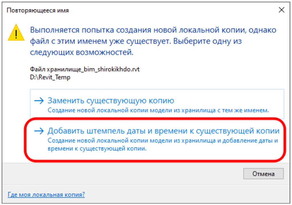 При создании локальной копии файла хранилища у вас будет высвечиваться окно, которое будет сигнализировать о том, что локальная копия для данного файла хранилища уже создана и что необходимо сделать с текущей локальной копией. При выборе первого варианта «Заменить существующую копию» новая локальная копия заменит старую. При выборе второго варианта «Добавить штемпель даты и времени к существующей копии» создастся новая локальная копия, а к старой добавится имя и дата. Настоятельно рекомендуется выбирать ВТОРОЙ вариант. За счет создания каждый раз новой локальной копии будет формироваться база архивов файла.