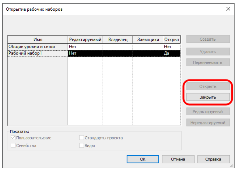 Во время открытия у вас высветиться окно с рабочими наборами, где с помощью «Открыть/Закрыть» вы можете управлять видимостью рабочих наборов. Примечание: открытие/закрытие рабочих наборов происходит локально, то есть не для всех пользователей в модели, а только для Вас. Далее нажмите «ОК».