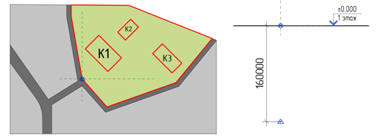 6. После того как известна вертикальная планировка территории, надо определить вертикальные отметки входов. В соответствии с этим перемещаем по высоте связанные файлы в файле ГП на нужную отметку. Площадку сохраняем.
