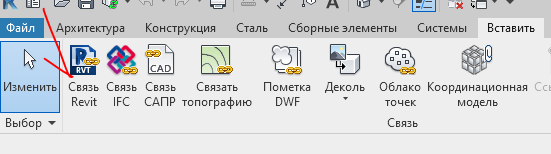 Для добавления связи переходим: Вставить — Связь Revit