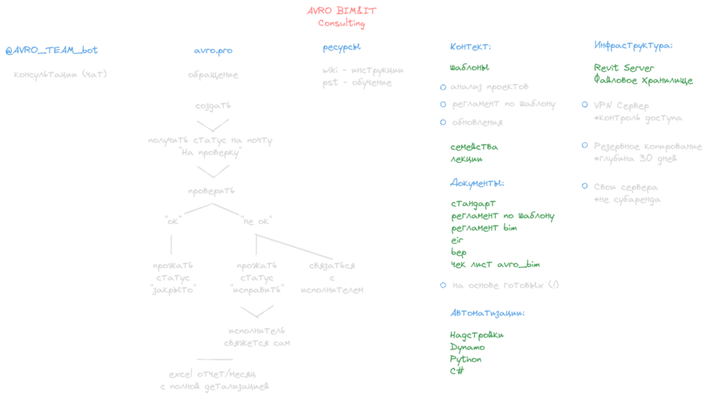 - шаблоны — для создания/ обновления шаблона компании требуется проанализировать текущие проекты, выявить основные элементы модели (виды, шаблоны, фильтры, спецификации, легенды, семейства), согласовать их с проектировщиками, внести в регламент по работе с шаблоном. Далее идут обновления по запросам.