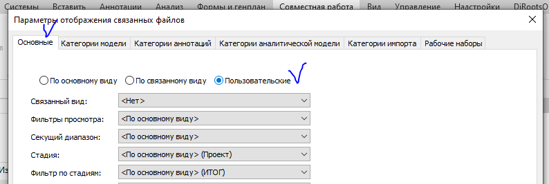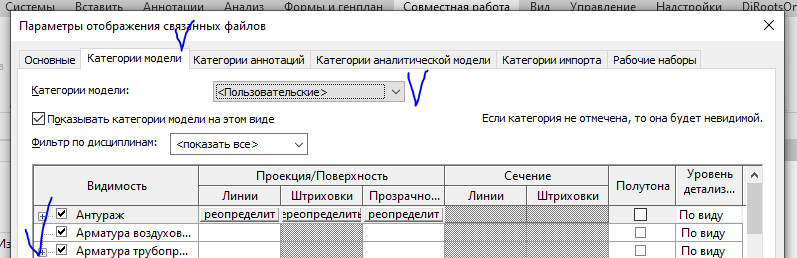 7. На вкладке Категории модели выбираем Пользовательские и отключаем категории которые не нужны