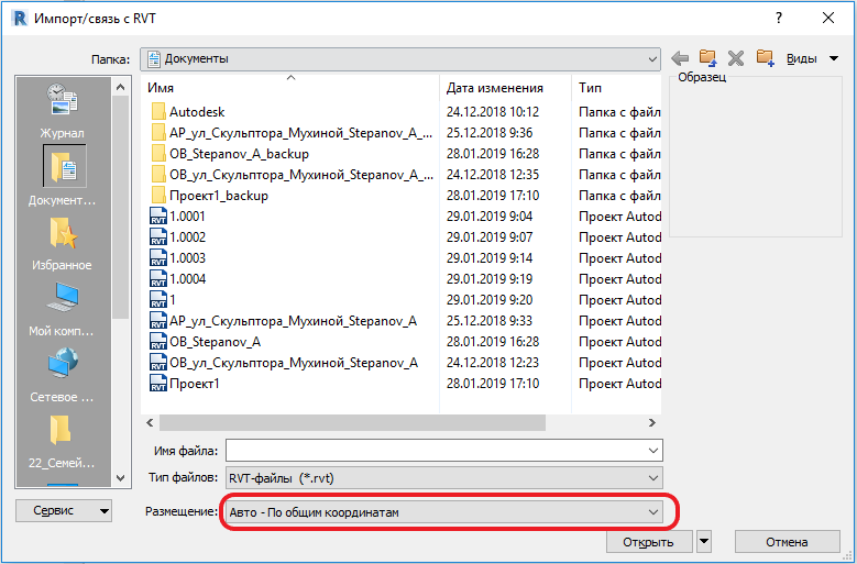 Специалист получает задание и подгружает модель через вставку модели Revit, размещение «По общим координатам».
