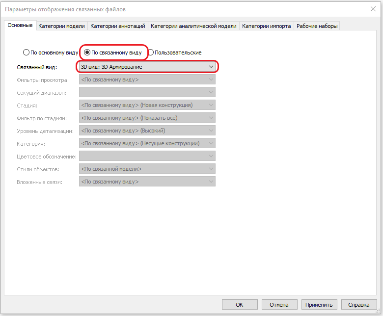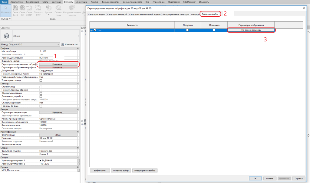 Затем создаём или копируем любой 3D вид и настраиваем параметры отображения связанной модели.