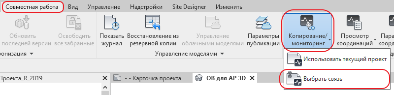 Переходим во вкладку «Совместная работа» и выбираем команду «Копирование/мониторинг», затем выбираем связь, с которой мы будем копировать и координировать элементы.