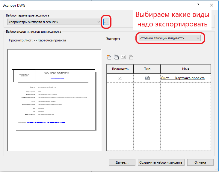 Выбираем какие виды надо экспортировать и нажимаем кнопку с тремя точками.