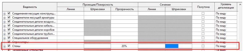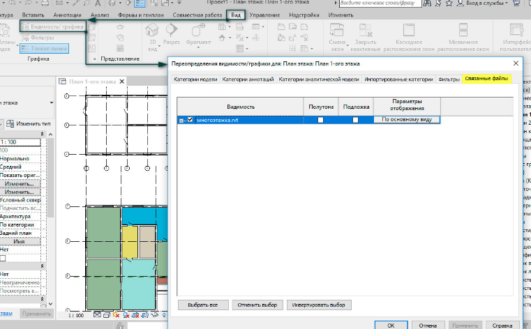 2.Настройка видимости/ графики для рабочей и связанной модели. При координации моделей АР/КР переопределяются элементы стен, колонн, перекрытий и др.