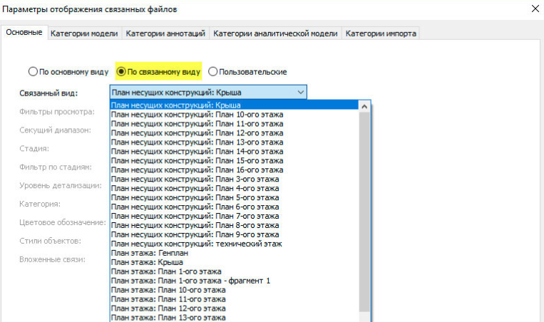 Параметры отображения «По связанному виду». И включаем вид, который нам выдали как задание.
